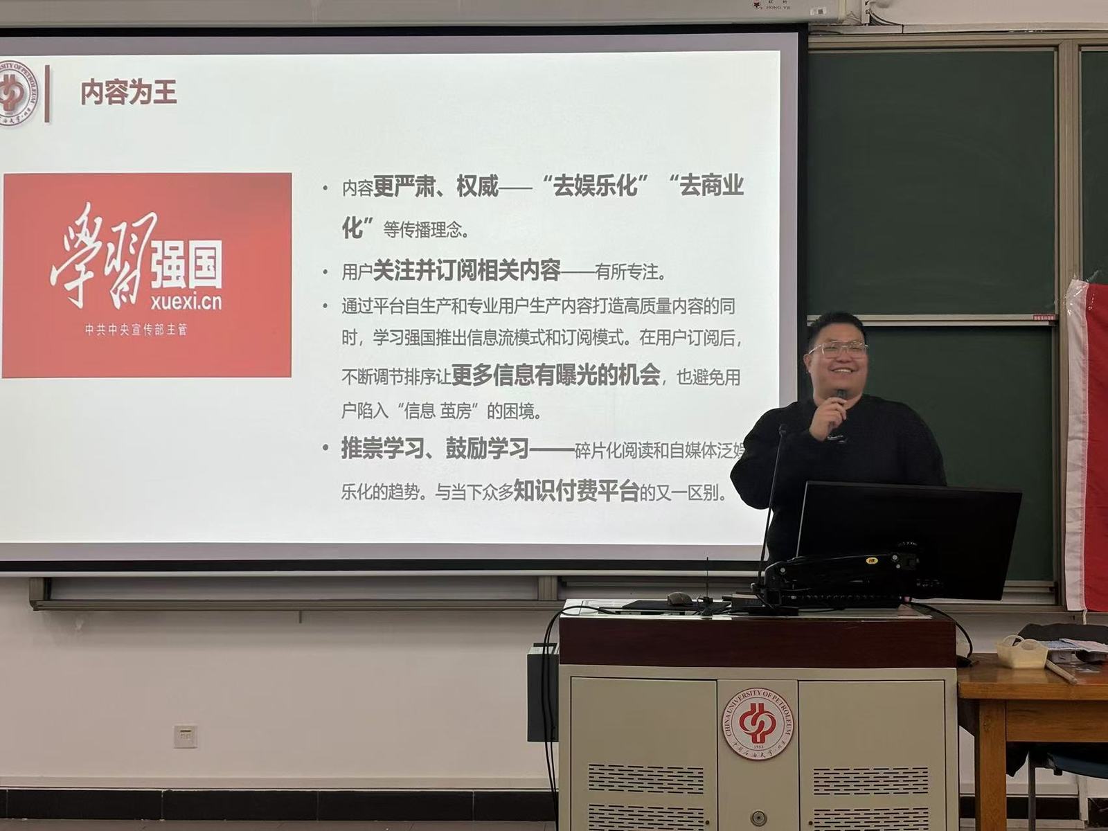 叶鹏以《融媒体时代文化创新传播中的文化自信》为主题,围绕文化自信在传统文化、网络文化、红色文化中的创新传播展开讲解,结合文化类原创综艺栏目、中华文化主题宣传片、党史动漫专题片等视频,激励青年们深入学习了解党史和中华优秀传统文化,坚定文化自信,传承红色基因,为实现中华民族伟大复兴的中国梦贡献青春力量。