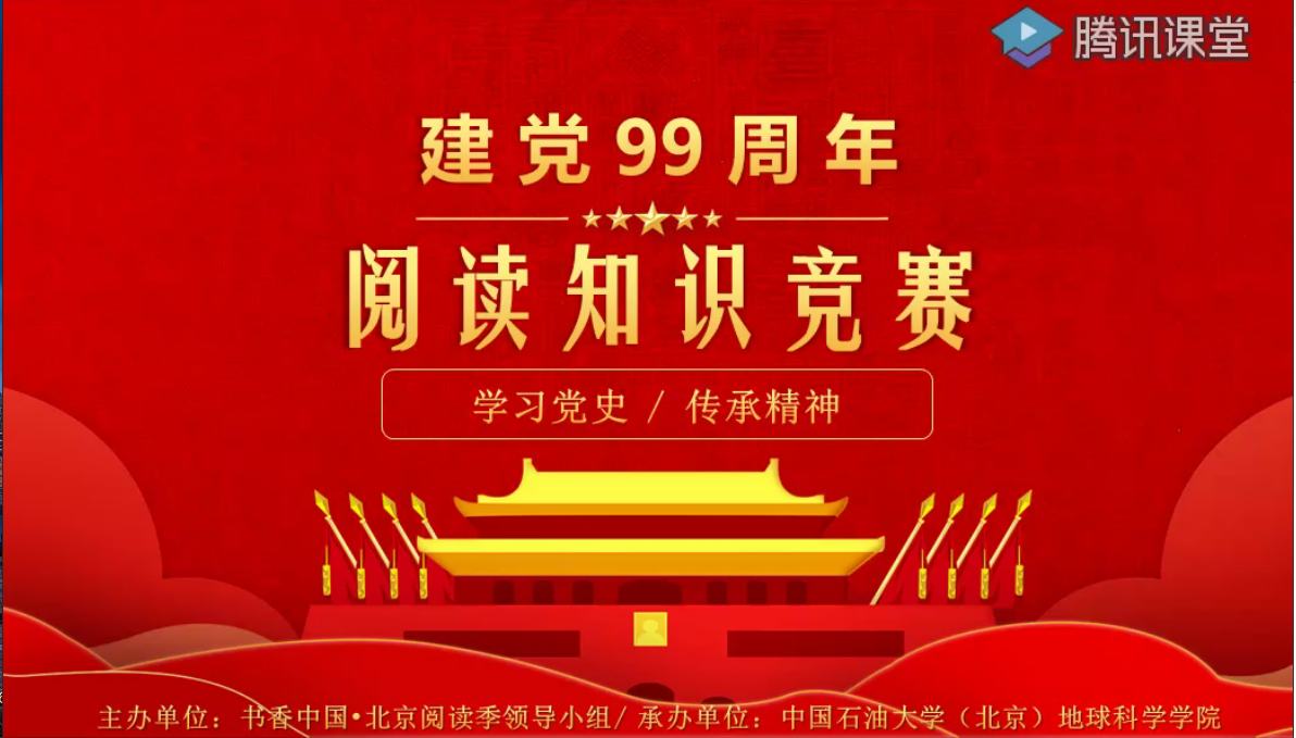 7月6日下午,为庆祝建党99周年,中国免费一级毛片(北京)地球科学学院联合书香中国·北京阅读季领导小组在腾讯课堂中举办了“建党99周年”阅读知识竞赛活动。