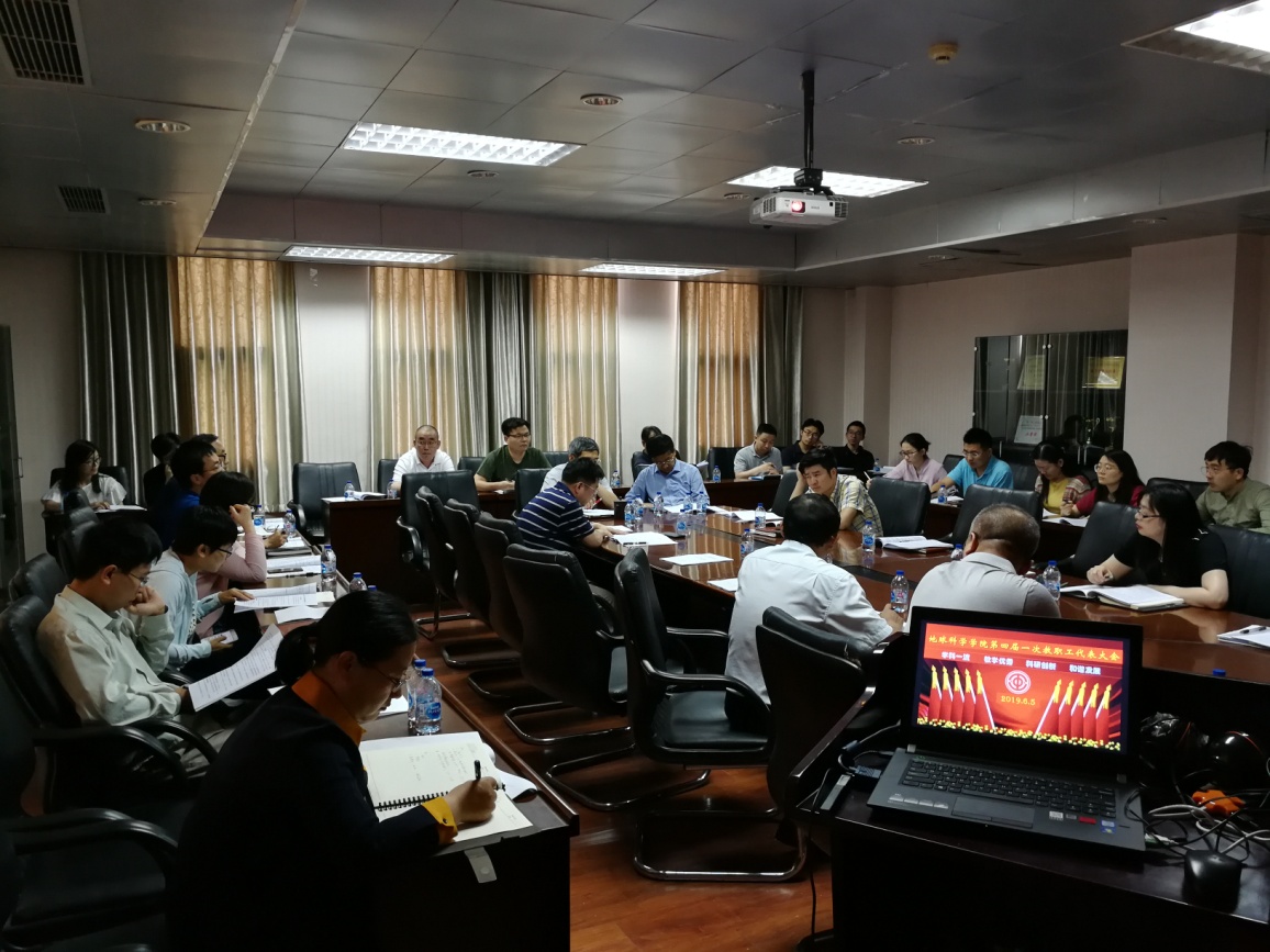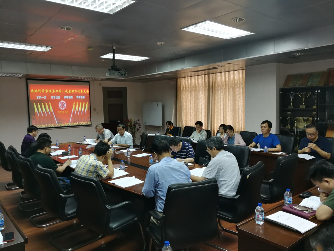6月5下午,在院工会组织下,地球科学学院第四届一次教职工代表大会在地质楼1105召开,共有29名正式代表和4名列席代表参加。教代会在庄严的国歌声中拉开帷幕,会议由学院党委书记王贵文和工会主席余一欣主持。本次教代会是地球科学学院进行院系调整后的首次大会,首先由王贵文书记对教代会代表换届选举进行了说明。院长曾溅辉作了2018年度学院工作总结,院工会主席余一欣作了2018年工会工作和财务情况报告,院办主任王宣赫作了2018年度学院财务工作总结报告。全体代表讨论、审议和表决通过了《地球科学学院2018年度院长工作报告》、《地球科学学院2018年度工会工作及财务报告》和《地球科学学院2018年度财务工作报告》。然后,院领导针对《地球科学学院2019年岗位聘任条件》、《地球科学学院2019-2022年聘期岗位考核实施细则》和《地球科学学院年度考核办法与考核标准(2019年修订稿)》等文件的制订进行了解释和说明,参会代表进行了认真的讨论和审议,并提出了一些修改建议,最后表决通过了上述三个文件。在会议总结时,王贵文书记首先感谢了各位代表对各类文件的认真审议,并强调教代会是加强我院教职工切实参与民主管理和民主监督,以及促进学院良性发展的重要途径和举措,同时也希望大家能积极参与工会活动。