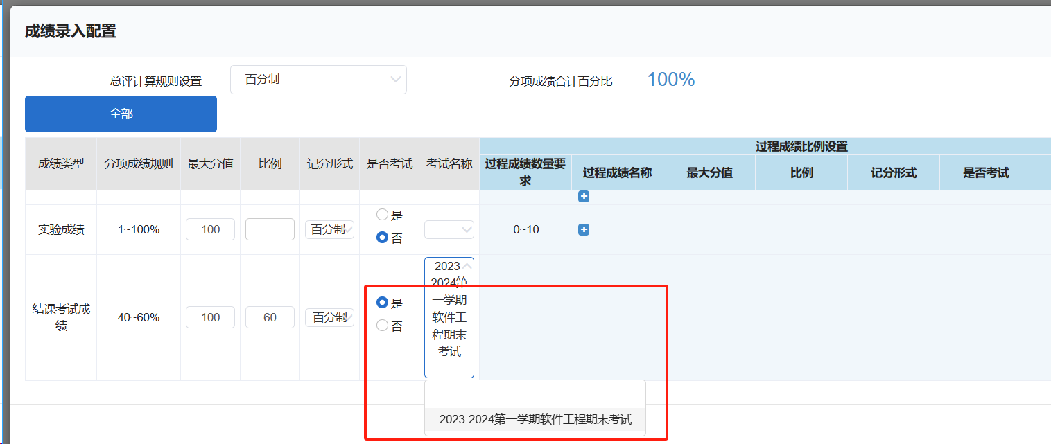注:若无对应分项,比例空着即可,不要填写0;填写分项比例后才能添加后面的过程成绩。