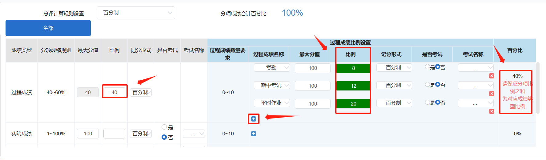 若教师录入成绩时,按照实际成绩进行录入而非满分100录入,则在录入各类过程成绩时,最大分值应填写实际最大分值,比例填写此类成绩在总成绩中的占比,占比之和仍需要等于过程成绩总占比。
