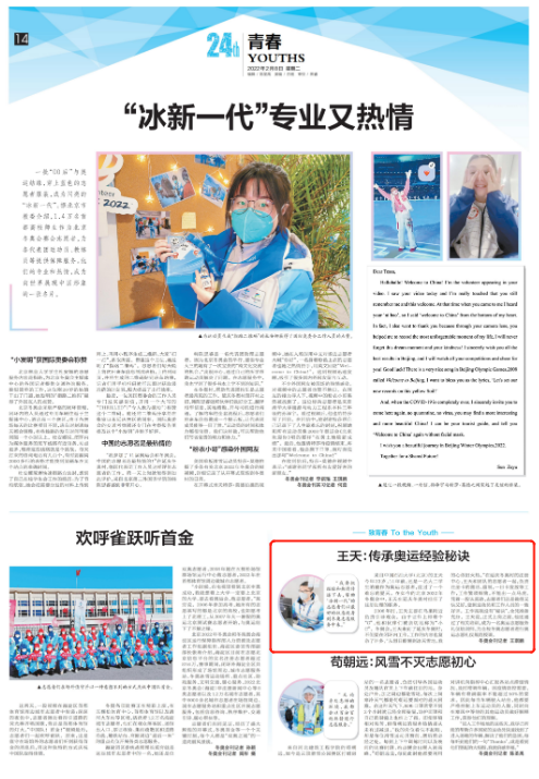 来自中国免费一级毛片(北京)的王天今年33岁,14年前,还是一名大二学生的他作为奥运志愿者,度过了一个难忘的夏天。在如今的北京2022年冬奥会中,王天在延庆冬奥村担任了注册助理的职务。