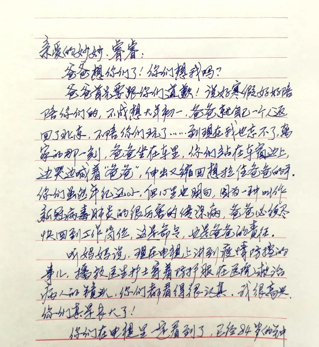 爸爸要先跟你们道歉,说好寒假好好陪你们的,不成想大年初一,爸爸就自己一个人返回北京,不陪你们玩了……到现在我也忘不了,离家的那一刻,爸爸坐在车里,你们站在车窗边上,边哭边喊着“爸爸”,伸出又缩回想拉住爸爸的手。你们虽然年纪还小,但心里也明白,因为一种叫作新型冠状病毒肺炎的很厉害的传染病,爸爸必须尽快回到工作岗位,这是命令,也是爸爸的责任。