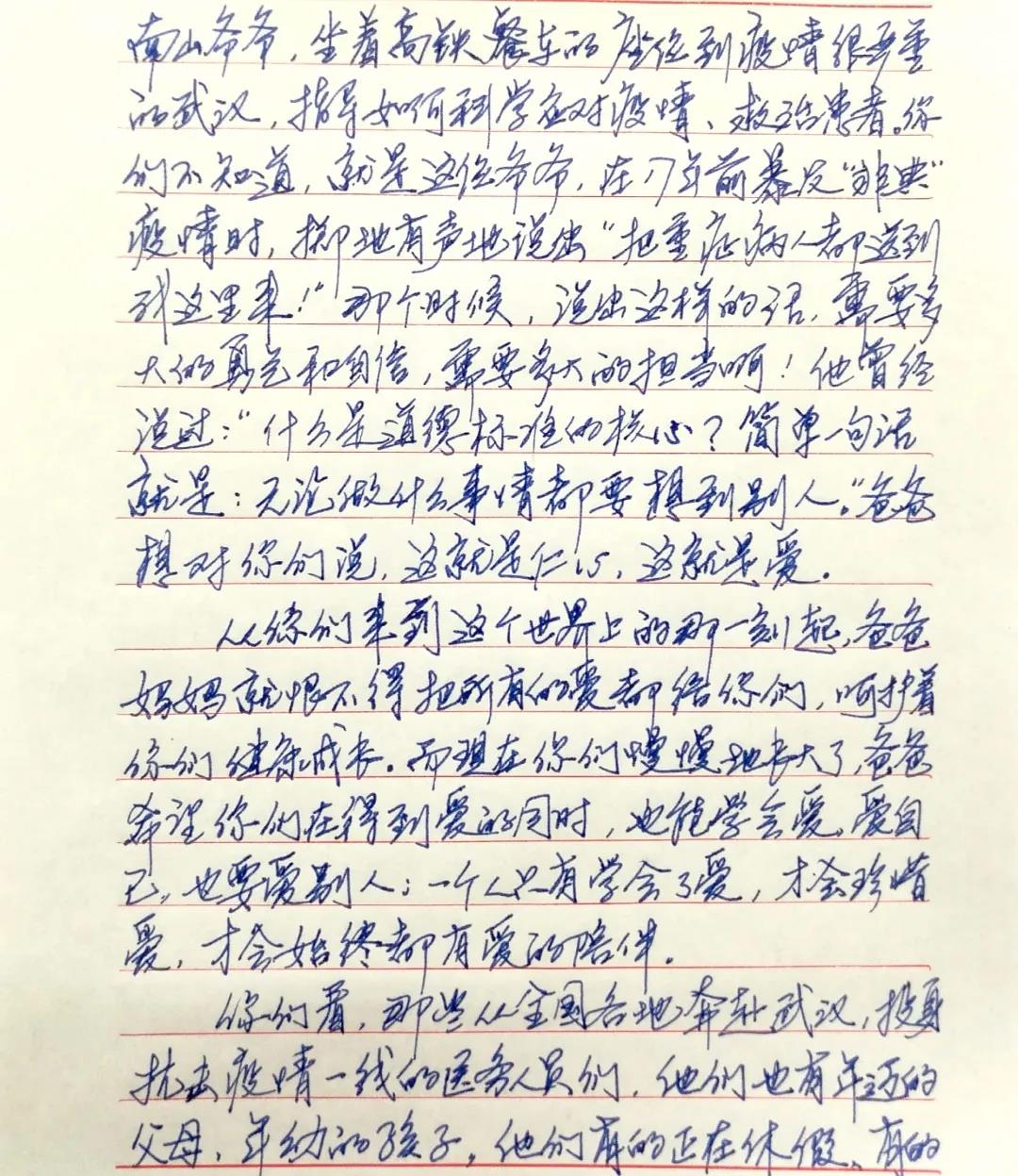 你们在电视里一定看到了,已经84岁的钟南山爷爷,坐着高铁餐车的座位到疫情很严重的武汉,指导如何科学应对疫情、救治患者。你们不知道,就是这位爷爷,在17年前爆发“非典”疫情时,掷地有声地说:“把重症病人都送到我这里来!”那个时候,说出这样的话,需要多大的自信和勇气,需要多大的担当啊!他曾说过:“什么是道德标准的核心?简单一句话就是:无论做什么事情都要想到别人。”爸爸想对你们说,这就是仁心,这就是爱。