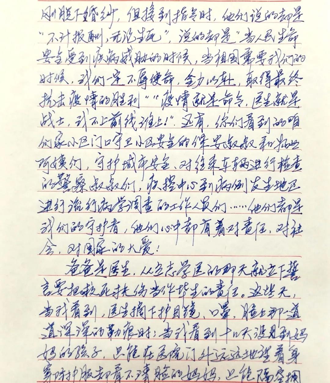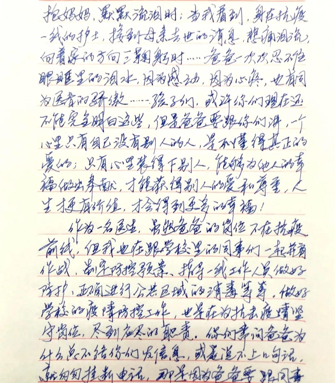 爸爸是医生,从立志学医的那天就立下誓言要把救死扶伤当作毕生的责任。这些天,当我看到,医生摘下护目镜、口罩,脸上那一道道深深的勒痕时;当我看到十几天没见到妈妈的孩子,只能在医院门外远远地望着身穿防护服却看不清脸的妈妈,只能隔空拥抱妈妈、默默流泪时;当我看到,身在抗疫一线的护士,接到母亲去世的消息,悲痛泪流,向着家的方向三鞠躬时……爸爸一次次忍不住眼眶里的泪水,因为感动,因为心疼,也有同为医者的骄傲……孩子们,或许你们现在还不能完全明白这些,但是爸爸要跟你们讲,一个心里只有自己没有别人的人,是不懂得真正的爱的;只有他心里装得下别人,能够为他人的幸福奉献,才能获得别人的爱和尊重,人生才更有价值,才会得到更多的幸福!