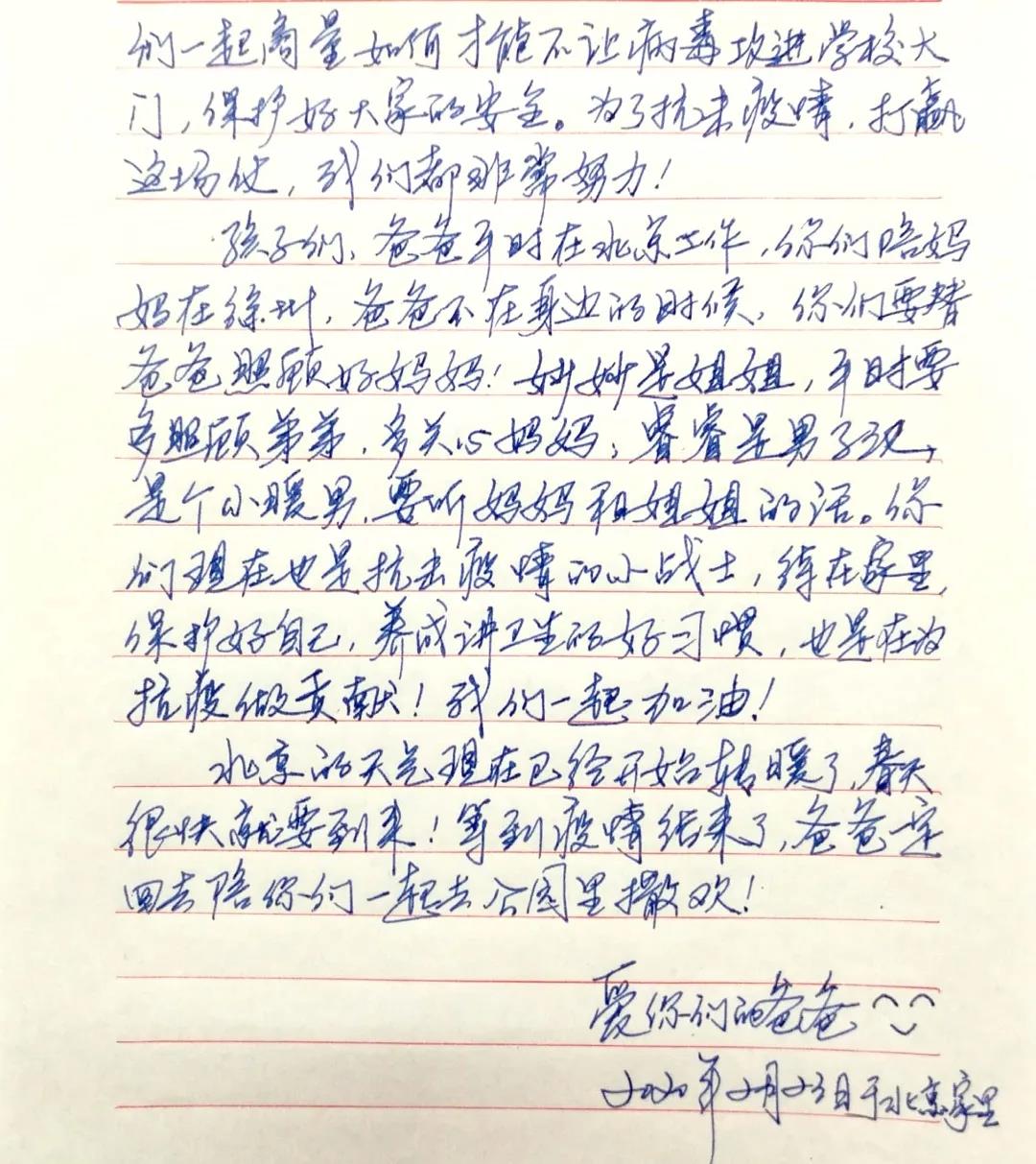 作为一名医生,虽然爸爸的岗位不在抗疫前线,但我也在跟学校的同事们一起并肩作战,制定防控预案、指导一线工作人员做好防护、正确进行公共区域的消毒等等。做好学校的疫情防控工作,也是在为抗击疫情坚守岗位,尽到应尽的职责。你们常问爸爸为什么总不给你们发信息,或者是说不上几句话,就匆匆挂断电话,那是因为爸爸要跟同事们一起商量如何才能不让病毒攻进学校大门,保护好大家的安全。为了打赢这场仗,我们都非常努力!