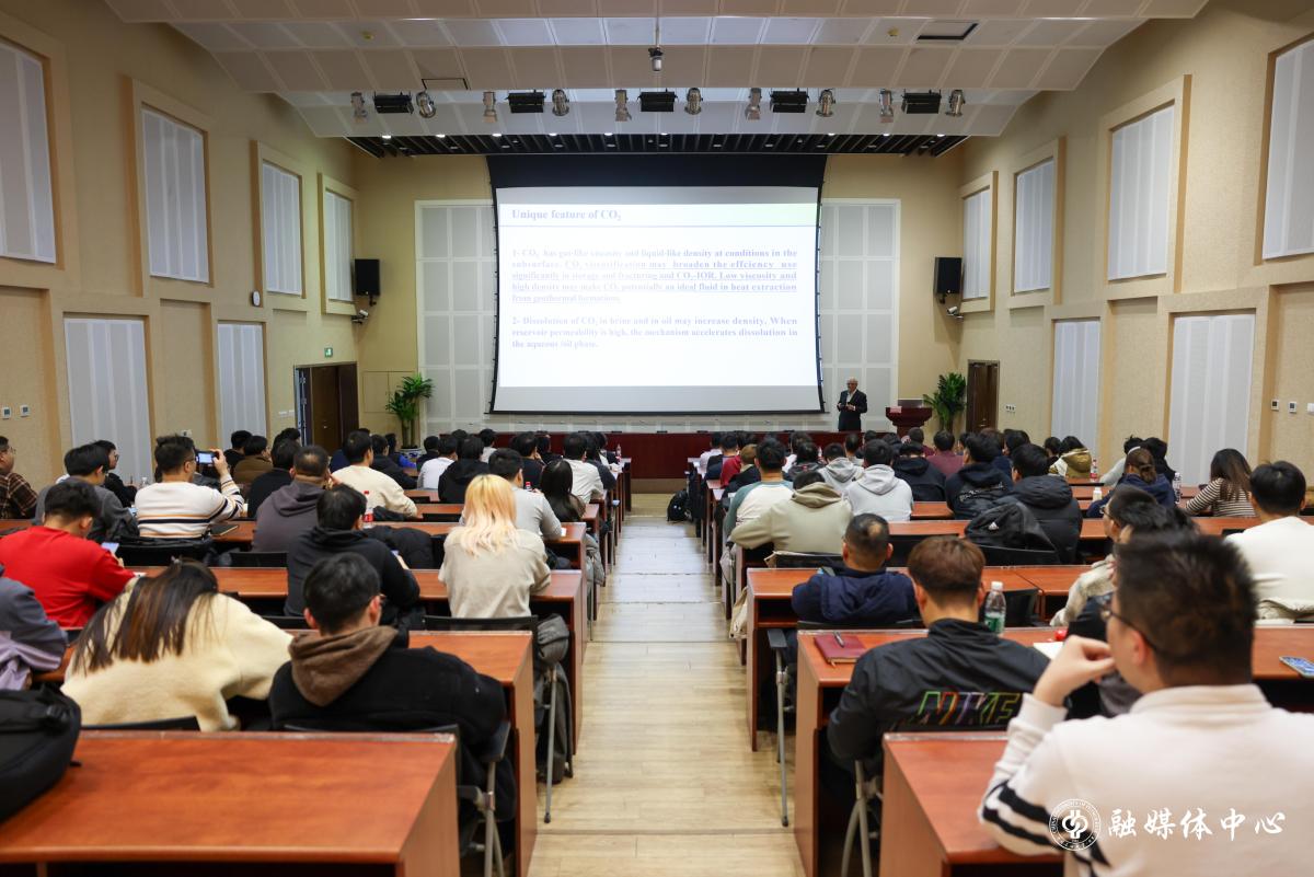 阿巴斯·费若扎巴迪院士详细介绍了他们研究团队在CO2咸水层封存、CO2压裂和地热资源开发方向的数值模拟进展。报告结束后,他与在场师生就CO2增稠试剂分子的研发与CO2压裂耦合地热开发的数值模拟等话题进行了深入交流。