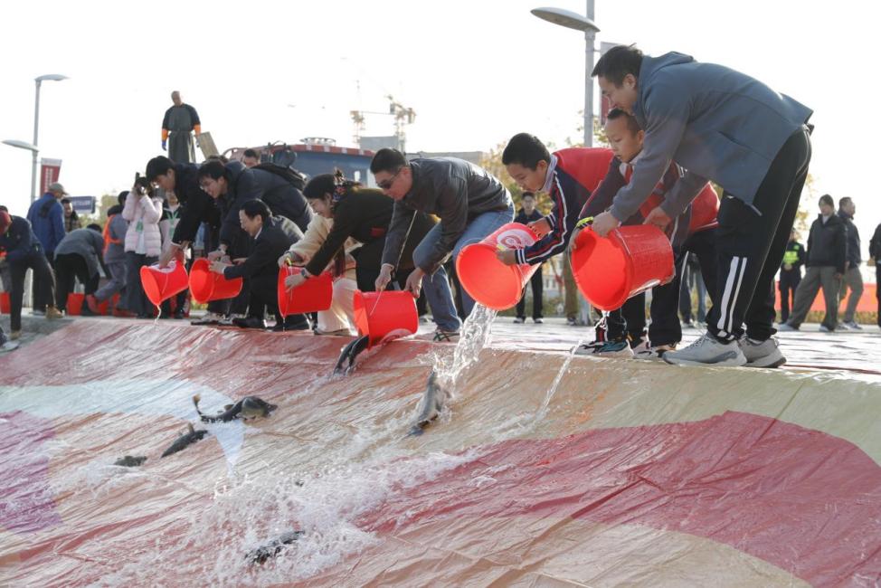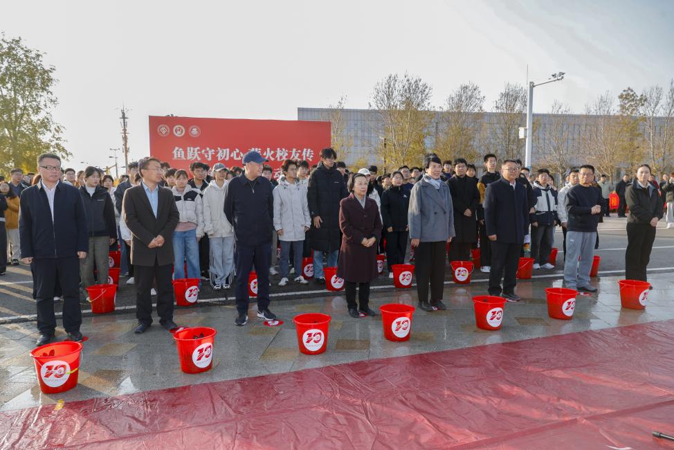 参加活动的师生及校友代表在红山湖畔放流区域将5000余尾鱼苗投进水中。一尾尾鱼儿跃入水面,荡开圈圈涟漪,不仅为这片精神地标注入了新的生机,更以“鱼跃人欢”的盛景,象征着中石大精神的蓬勃生机与薪火相传。