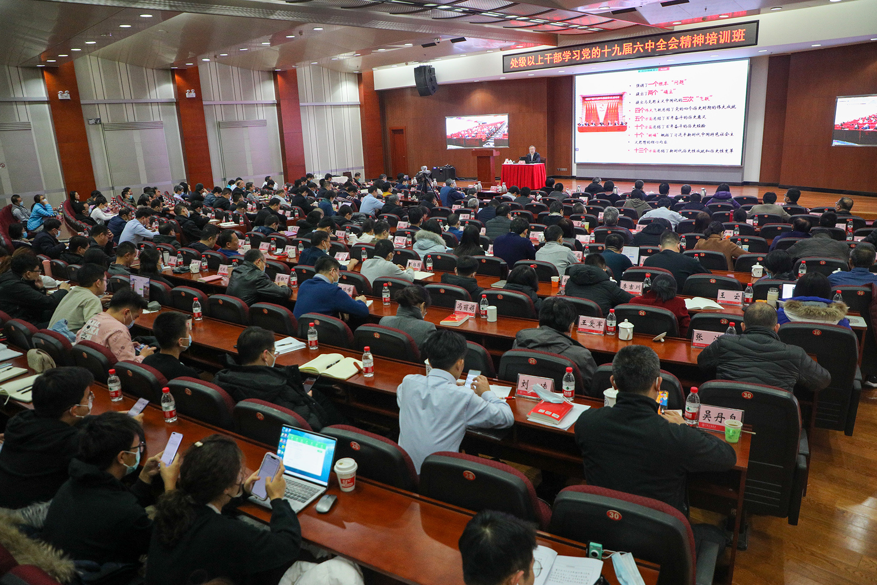 学校党委书记陈峰以“深入学习贯彻党的十九届六中全会精神 以政治能力为统领,全面提升领导干部综合能力”为题作了专题辅导报告。他带领与会同志全面学习了六中全会《决议》的主要内容。他指出,党的十九届六中全会是在我们党成立一百年之际,党领导人民实现第一个百年奋斗目标、向着实现第二个百年奋斗目标迈进的重大历史关头召开的一次具有重大历史意义的会议。全校各级党组织和党员干部务必把学习宣传贯彻六中全会精神作为当前和今后一个时期的重大政治任务抓紧抓实抓好。