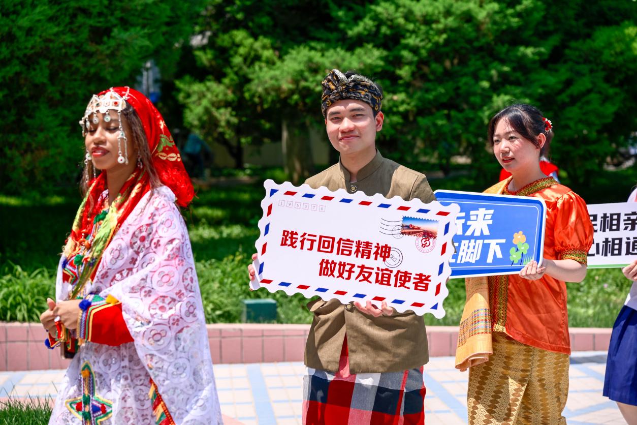 本届文化节特别邀请60名中外青年学子,穿着各国传统服饰,在舞台上展示青春风采,围绕学校喷泉广场完成多元文化巡游。巡游过程中,青年学子高举“践行回信精神,做好友谊使者”“讲好中国故事”“民相亲,心相通”等手持牌,跟随音乐节拍与在场观众热情互动。