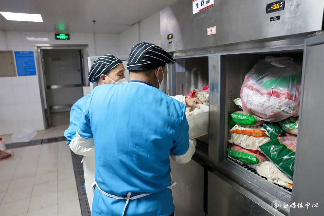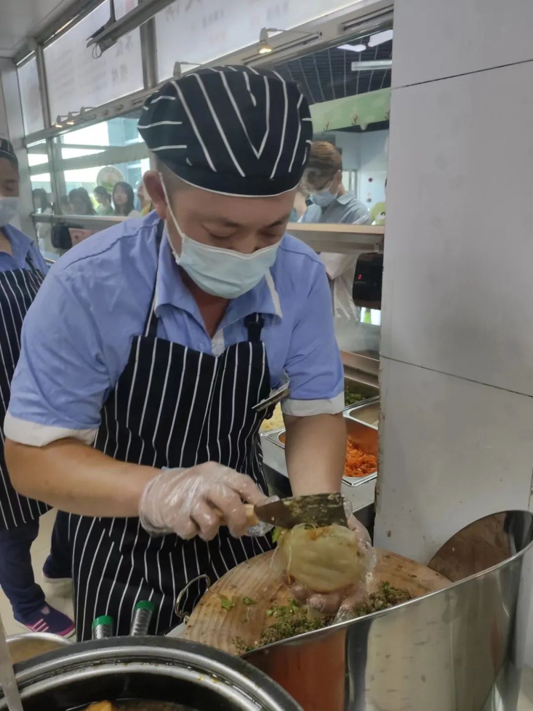 跟刘海涛一样的餐饮人员还有很多。面对巨大的供餐压力,餐饮师傅们常常通宵备餐。凌晨2点,就已起床接收原材料;凌晨3点,开始准备早餐包子的加工。天还未亮,就全员集结,开始打包早餐。灯火通明的食堂里,处处是餐饮人忙碌的身影。