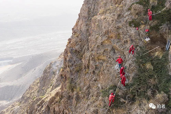 2019年10月26日,新疆塔里木盆地,天山南麓,物探工人要通过绳索才能爬到山腰作业。