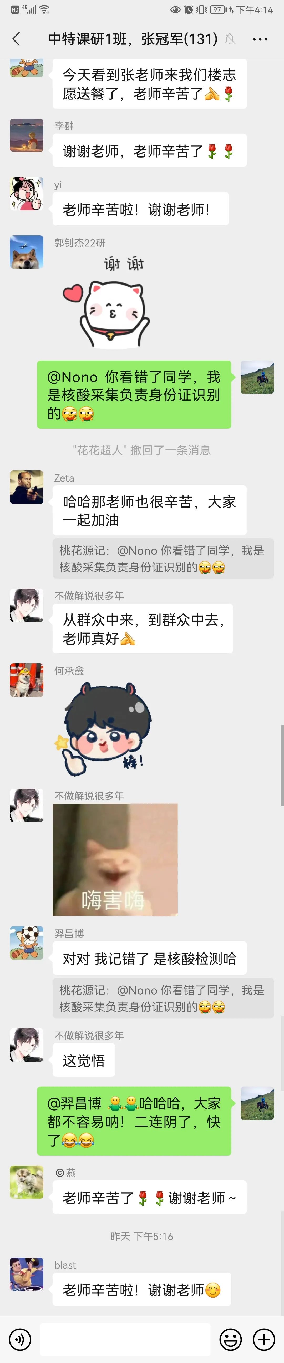 12日上午,正在东校园学生宿舍协助医务人员开展核酸检测的张冠军,忽然听到学生说了句:“谢谢张老师!张老师辛苦了!”后来连续四五个宿舍的学生,都作了同样的表达。