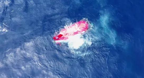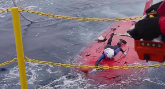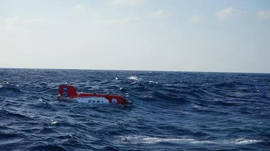 经过8个多小时的水下连续作业,黄昏时分,“深海勇士号”上浮到海面上,通过缆绳吊装,“深海勇士号”载人深潜器稳稳地坐落到“探索二号”母船上,下潜任务圆满完成。