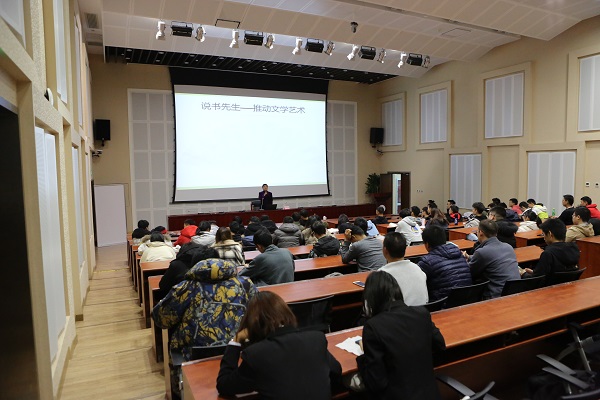 王封臣介绍了评书的“前世今生”,讲述了评书推动文化扫盲与文学艺术发展的作用,展示了评书的折扇、醒木、手绢等三大道具,并为现场师生讲了一段《三顾茅庐》评书。报告会后,王封臣与现场师生就评书的未来、评书如何与外国文学作品结合以及如何用评书在新时代讲好中国故事等展开了交流。