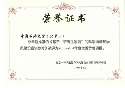 石大一项目荣获北京市科学道德和学风建设宣讲教育优秀示范项目