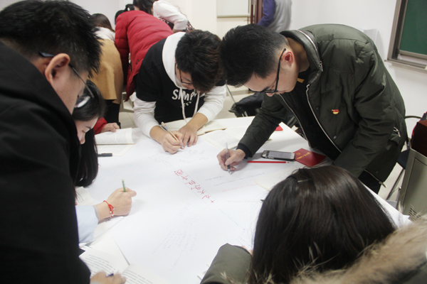 地球科学学院研17级油气田勘探地质第一党支部书记江梦雅在课后收获中写道:“本节课使用了新的教学模式,相较于以前的学习模式,课堂氛围活跃,调动了大家的积极性,使我们的学习和体会更加深入。在分组制作十九大报告思维导图的过程中,大家分工协作,也促进了学生党支部书记之间的交流。”石油工程学院研钻井17-2党支部书记王财忠写道:“热情似火地学习,充分彻底地互动!随机分配都能遇到那么好的同学,学习方式棒棒哒!”