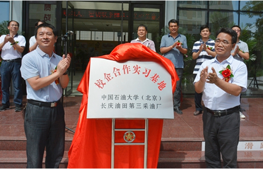 7月7日,石油工程学院和长庆油田采油三厂联合建立的校企合作实习基地揭牌仪式在银川举行,石油工程学院党委书记宁正福和长庆油田采油三厂总地质师马永宁为实习基地揭牌。