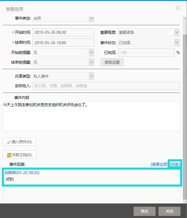 双击具体的共享事件进行查看。事件的所属人、发起人以及所有共享对象可以回复共享事件,也可以看到他人回复的内容。 点击【回复】 也可以留言。