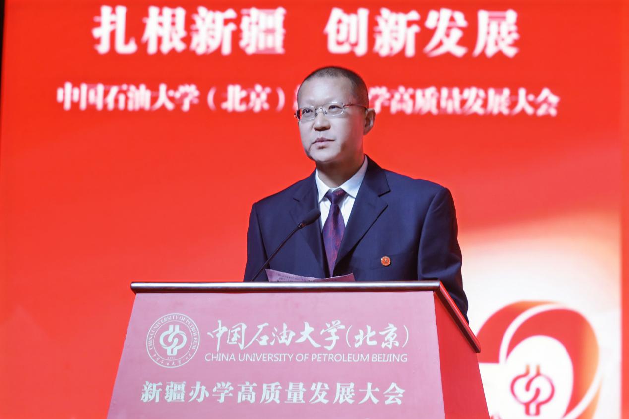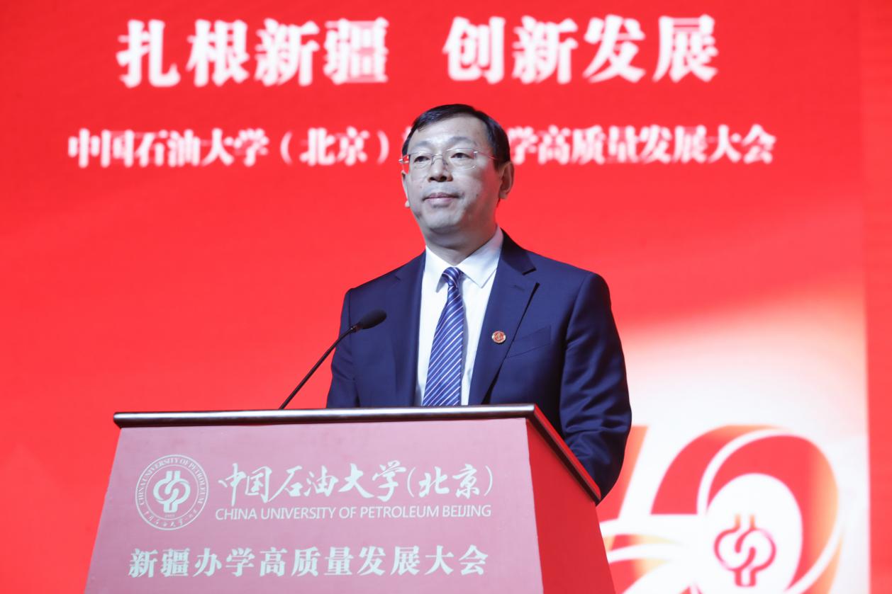 王同奇在主持中表示,十年来,全体中石大人勠力同心、奋楫笃行,在新疆这片热土上,用鲜活的办学实践,书写了一份高校服务党和国家重大战略的政治答卷,绘就了一张建设世界一流大学宏伟征程在祖国边疆的生动画卷,续写了一幅中石大精神在新时代传承创新的历史长卷。站在新起点上,学校将继续坚持以习近平新时代中国特色社会主义思想和党的二十大和二十届二中、三中、四中全会精神为指导,深入贯彻落实习近平总书记给学校两次重要回信精神和全国教育大会精神,在建设教育强国新征程上,牢牢把握教育的政治属性、人民属性、战略属性,追求卓越、奋勇前行,推动克拉玛依校区扎根新疆,加快“四个基地”建设,为全面推进中华民族伟大复兴贡献中石大力量。