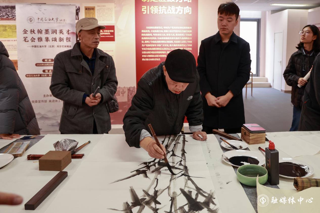 10月22日,中石大“金秋翰墨润英才 笔会雅集颂新程”书画笔会活动在主楼风华艺苑举行。中国美协理事、国家一级美术师、北京美协原常务副主席兼秘书长贺成才,中国美术家协会会员、中国诗书画研究会副会长李如,中国书法家协会会员、原中央国家机关书法家协会常务副主席罗美富,中国书法家协会会员、河北省企业文联书画艺术委员会副主任任东会等书画名家,以及学校退休教师余世诚、刘冯瑜等应邀与青年学子共话以文化人、以美润心,交流书法绘画心得,以笔墨致敬石油精神,以色彩描绘时代新程。