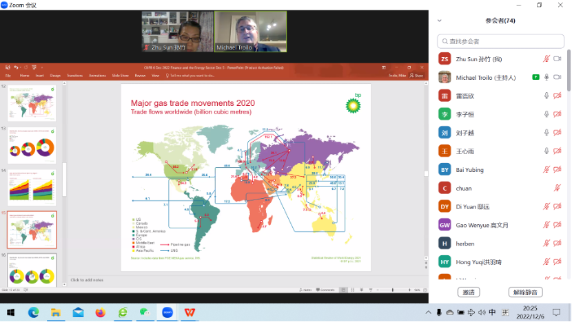 本次全英文讲座中,Michael教授对比分析了全球各地区原油、天然气、煤炭及新能源生产、消费及进出口贸易状况,并围绕期货、远期、期权、互换等金融工具在能源行业的应用进行讲述。教授的讲解深入浅出,生动有趣,深受同学们喜爱。同学们讲座前用心预习和准备,讲座期间,充分把握与教授交流的机会,以文字、语音等形式踊跃提出问题和想法,教授一一用心解答,并对同学们所提的问题赞不绝口。师生互动积极,现场气氛融洽。