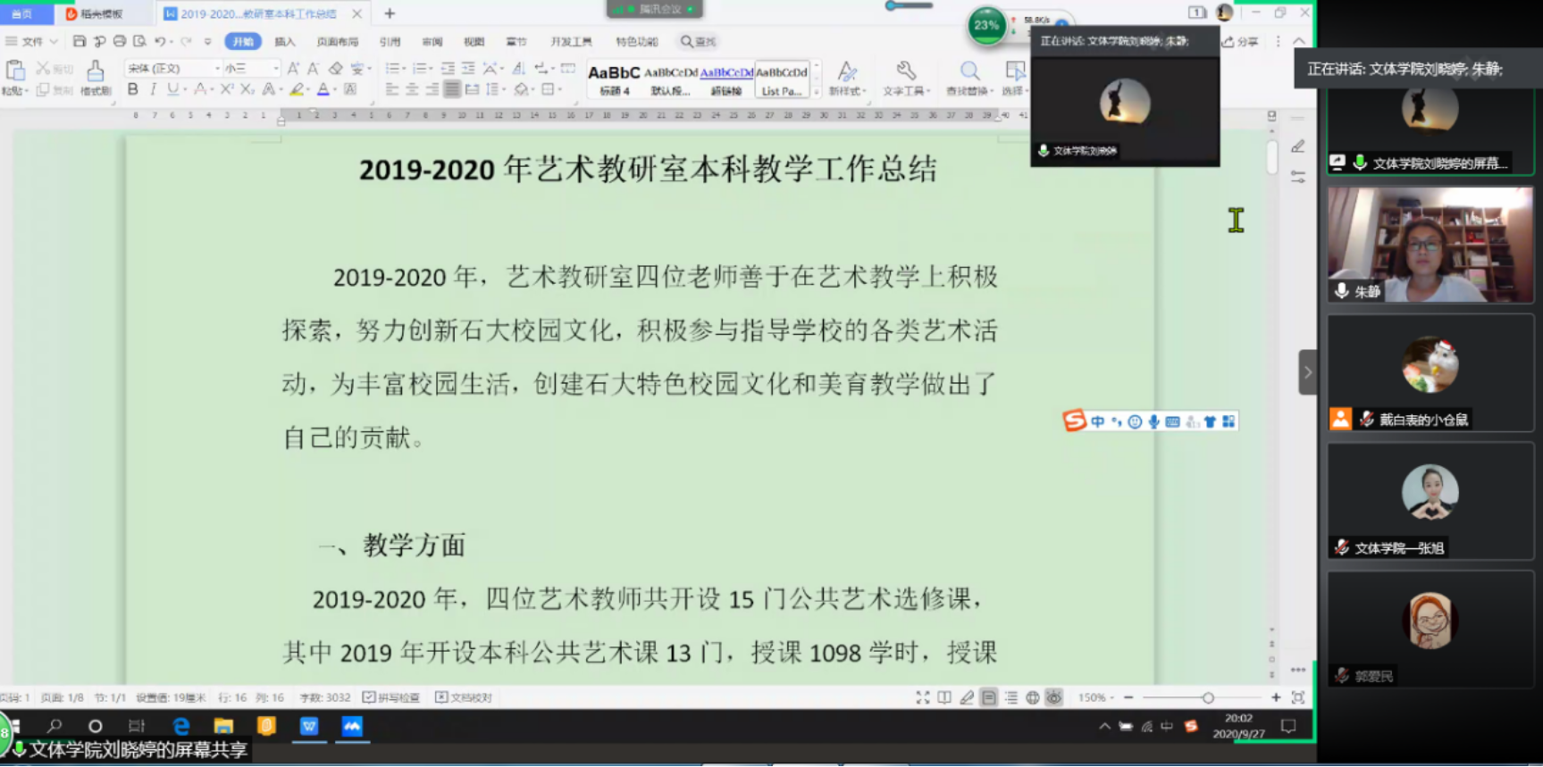 2020年9月27日,体育与人文艺术学院线上召开了2019-2020学年本科教学质量分析报告会,会议由学院教学副院长朱静主持,文体学院全体教职工参加了会议。