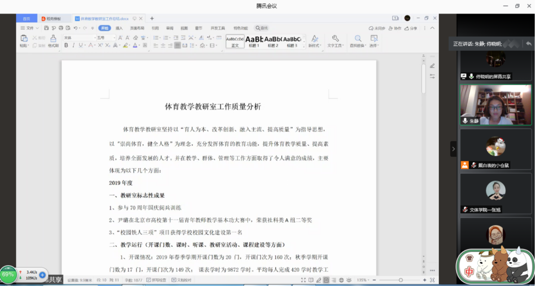 会议主要对文体学院各学科近一年来的教学工作进行总结。体育、人文和艺术三个学科的教研室主任分别从教学运行、科研工作、教学管理和开展活动等多个角度对各学科过去一年中取得的成就进行归纳,展现了各学科良好发展的面貌。