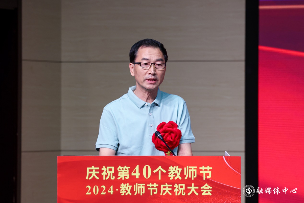 王同奇代表学校党委向全校教师提出了殷切期望。他指出,学校正处于抢抓战略机遇和推动高质量发展关键期,面临时代使命更重、办学空间增大、发展赛道拓宽的新形势。希望广大教师:一是要坚定信念守初心,担当“大使命”。将胸怀天下的价值理想追求与实现中华民族伟大复兴结合起来,将教育家精神融入落实立德树人根本任务,把“躬耕教坛、强国有我”落到实际行动中,强化对青年学生的政治引领、价值引领,确保党的事业和社会主义现代化强国建设后继有人,在至诚报国的“大我”追求中实现个人理想抱负。二是要明德修身长才干,砥砺“大德行”。要自觉砥砺品行、用优良德行,树立教师的崇高形象,引导学生走好成长的每一步。要苦练育人本领,树立终身学习的理念,以使自己拥有源源不断的力量源泉,时刻为学生提供鲜活的成长清泉。三是要躬体力行勇担当,展现“大作为”。站在知识发展前沿,遵循教育规律和人才成长规律,在潜心教书育人、勇攀学术高峰、弘扬人间正道上彰显担当、展现作为,在推动学校事业高质量发展的新征程上开拓新路、再创佳绩。