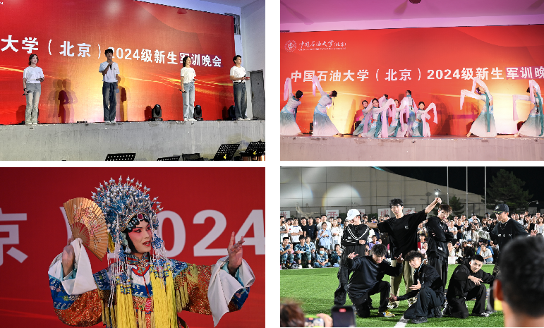 演出分为上下半场。上半场,校团委青年文化发展中心八大艺术团、石光音乐工作室、石长乐相声社和觅音社带来了包含管弦、民乐、合唱、京剧、舞蹈、话剧、朗诵等形式的表演,展现了中石大美育类学生组织和社团的青春活力;下半场,2024级本科新生带来表演,为军训生活增添了别样风采。