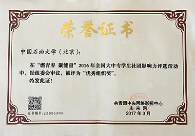 近日,共青团中央网络影视中心、团中央未来网公布了“燃青春 聚能量”2016年全国大中专学生社团影响力评选活动结果。石大获2016年全国大中专学生社团影响力评选活动优秀组织奖,并有4家学生社团获得优秀社团奖。