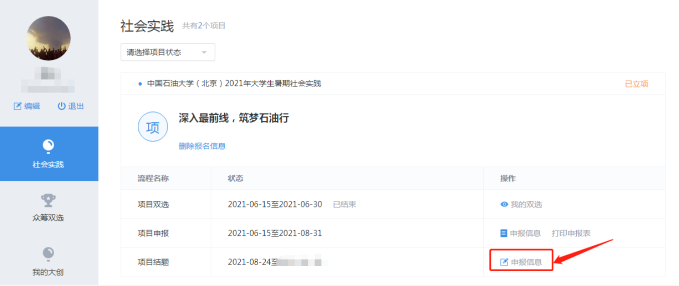 实践成果包括实践总结、调研报告或论文、访谈记录、观察报告或工作报告、照片、视频等资料。所有实践团队按要求认真整理总结实践成果(具体要求见《附件1:实践成果收集说明》),由队长从电脑端登录http://sct.dgshinko.com/,到个人中心项目结题-申报信息处填报。